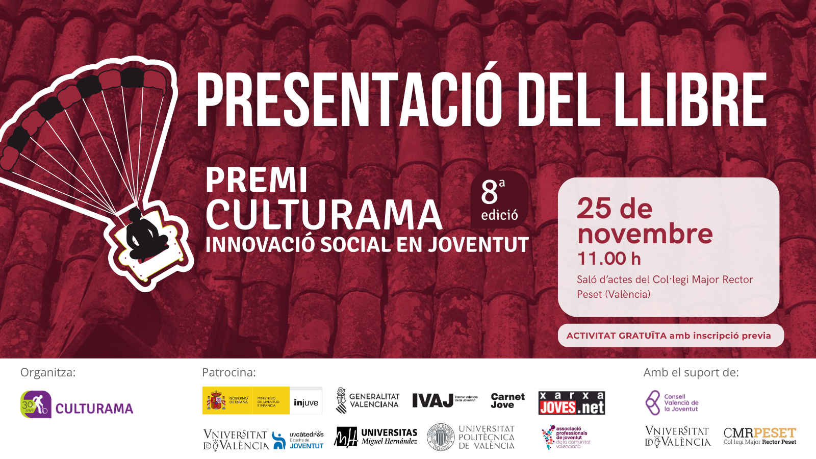 El acto de presentación tendrá lugar el 25 de noviembre a las 11:00 h en el salón de actos del Colegio Mayor Rector Peset, y contará con la participación de las personas premiadas en la última edición del Premi Culturama Innovació Social en Joventut.